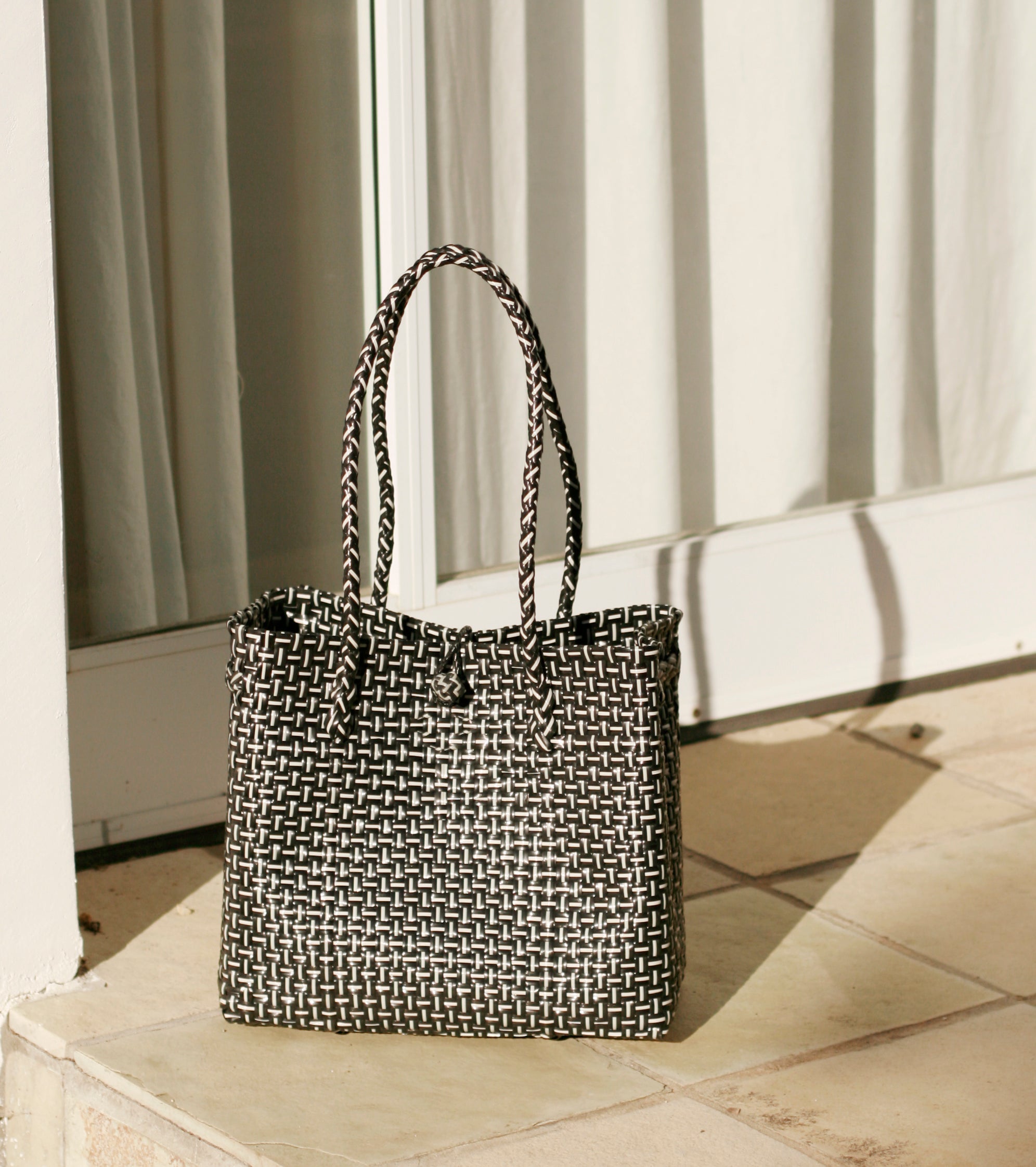 Painstakingly handwoven using recycled plastic in their homes in Bali, each bag measures around 12.5" H x 13" W x 8" D with a handle drop of 9 inches.