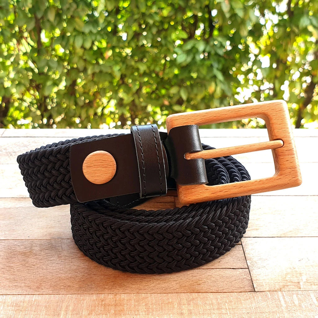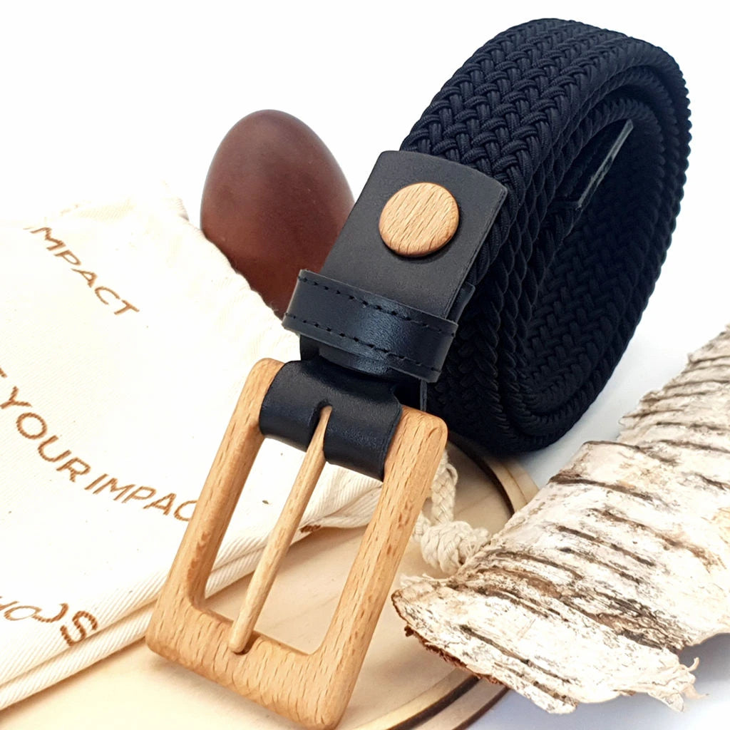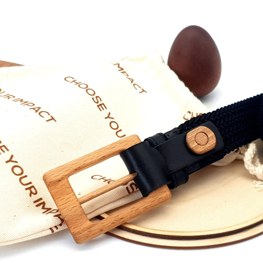 The belt's buckles are made from upcycled wood offcuts, paired with sustainable braided cotton. Suitable for both men and women, its no holes design and use of stretchable cotton offer maximum comfort.