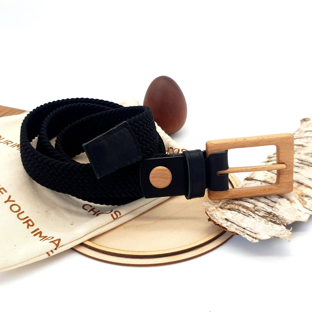 Indulge in sophistication and luxury with this Cotton & Wood Braided Belt. This accessory features a delicately curved buckle in a timeless rectangular shape, meticulously crafted with minimalistic sensibilities. The 30mm wide belt is ideal for formal occasions, and the use of beech wood ensures durability and strength. The combination of braided cotton and viscose, known for its elasticity, results in a lightweight, breathable, renewable, and eco-friendly product. The classic black color adds a touch of timeless elegance to this unique blend of nature and fashion.